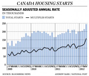 “This report reflects unbelievable strength in Canadian housing starts, and all of the gain was in multiples again which reflect the ongoing Canadian condo craze,” said Scotia Capital economist Derek Holt.